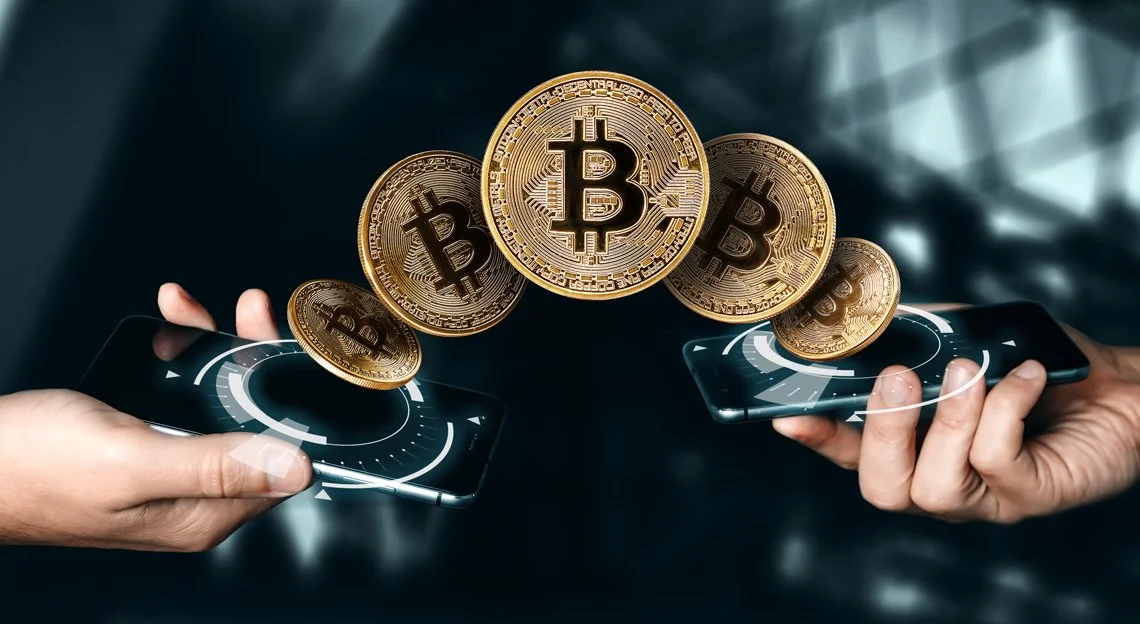 The image depicts two hands holding smartphones, with golden Bitcoin symbols floating between them, representing the transfer of cryptocurrency from one device to another. The glowing circular interface on each phone emphasizes the futuristic and digital nature of the transaction.
